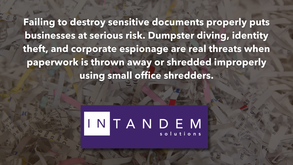 Whether you need a one-time purge or ongoing shredding services, taking action now can prevent costly problems down the road. Intandem Solutions offers secure, dependable document destruction services designed to fit your business’s needs.